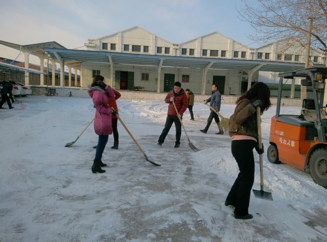 近日秦皇岛连续两天降雪,为确保我厂生产安全和职工的安全出行,雪一停,全厂职工在厂部领导的带领下,冒着严寒对厂区及内外道路上的积雪进行了清理。热火朝天的扫雪场面给这个寒冷的冬季带来一丝暖意。每位员工投入十二分的热情,各尽所能,克服天气严寒、扫雪工具有限等困难,用各种简易的工具为厂区开辟了安全畅通的道路。这不仅为生产安全和全体职工的行走安全提供了有力的保证,而且显示了我厂职工工作的积极性和热情。