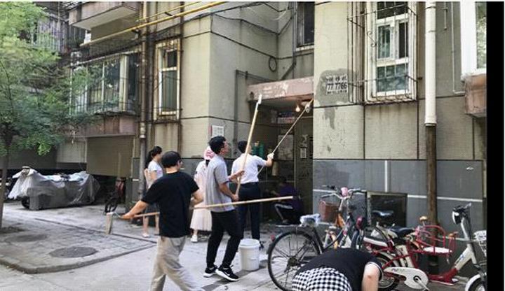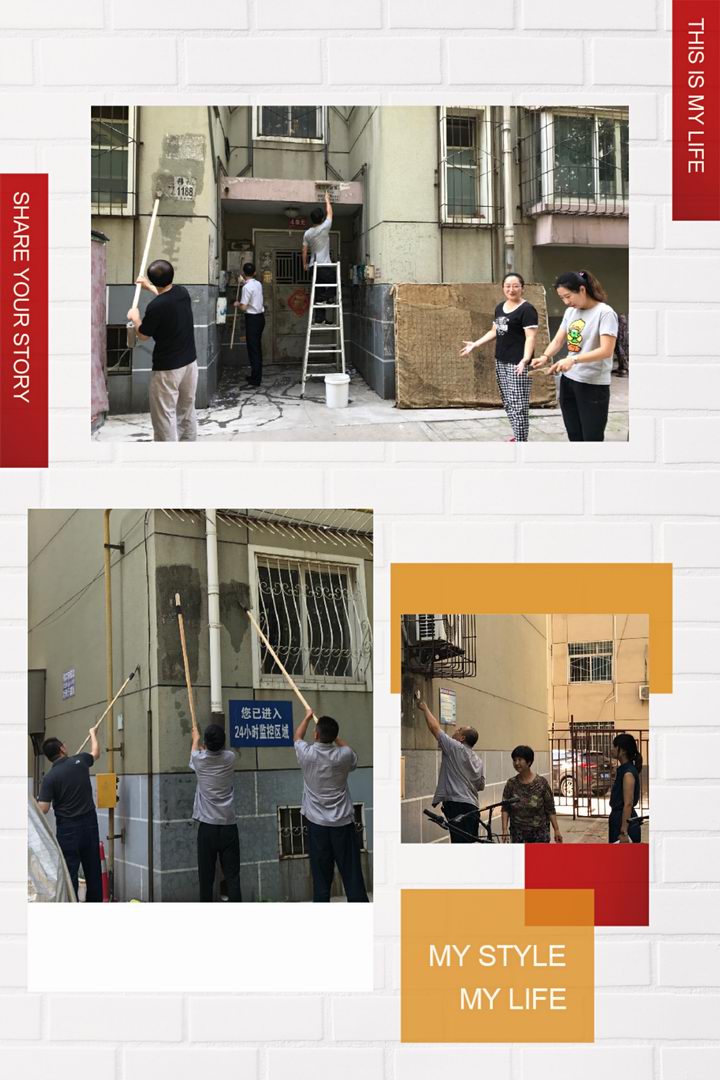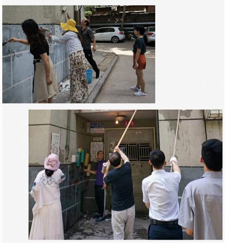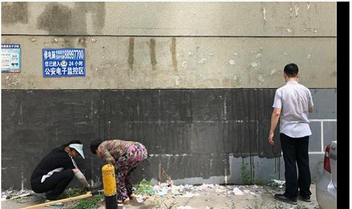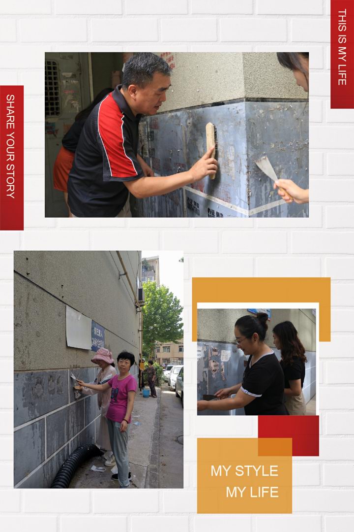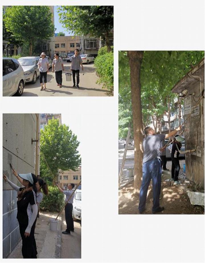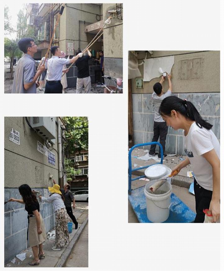 女同志们发挥优势耐心细致处理低处的小广告,男同志们登高爬梯汗流浃背,沙子蹦到眼里、涂料溅到身上毫无怨言。