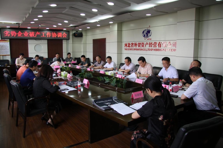 李光副主任介绍了省国资委劣势企业破产退出有关情况。会议听取了我公司拟破产退出企业工作情况及退出思路等有关情况汇报,对如何推进省外贸资产公司所属劣势企业破产具体工作进行了研究;省高院通报了我省企业破产工作的总体情况,石家庄市中院通报了破产案件审理有关情况。会议原则同意集中管辖受理我公司破产案件,并建立简化程序、加快推进、统筹协调的联动工作机制。