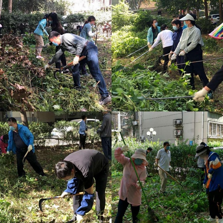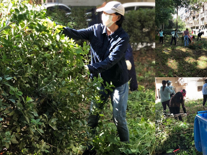大家有的拿镰刀、有的拿耙子,有的拿大剪刀,扫帚,有的负责清运。修剪冬青、清除杂草和各类废弃的生活垃圾。
