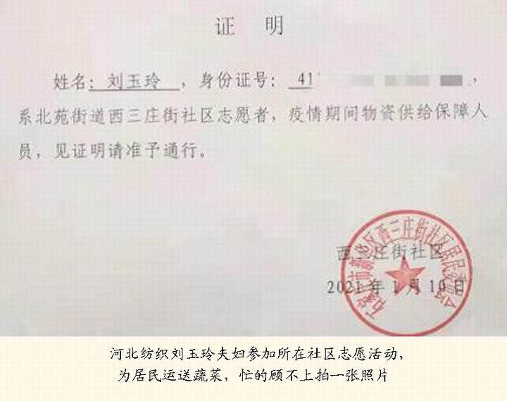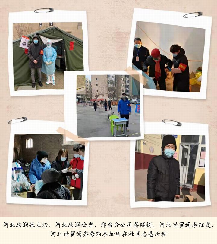 还有很多志愿者,如公司总部祖国忠、河北世贸通赵利丽、河北洲易联宋胜武、河北纺织刘玉玲夫妇……他们一直忙碌在社区疫情防控的前沿阵地,甚至没有时间停下来拍一张照片。