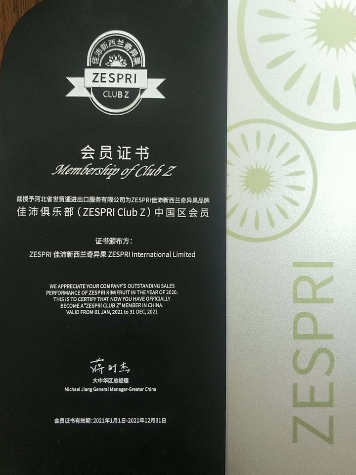 经过与新西兰佳沛、上海佳农多轮的考察、论证和谈判,河北省世贸通进出口服务有限公司于近日取得新西兰“佳沛”奇异果Club-z会员资质,获得上海佳农公司河北省唯一指定代理商。