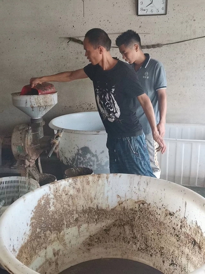 育苗车间的同志们有的磨料、投饵,有的整理饵料片子,忙的不亦乐乎。