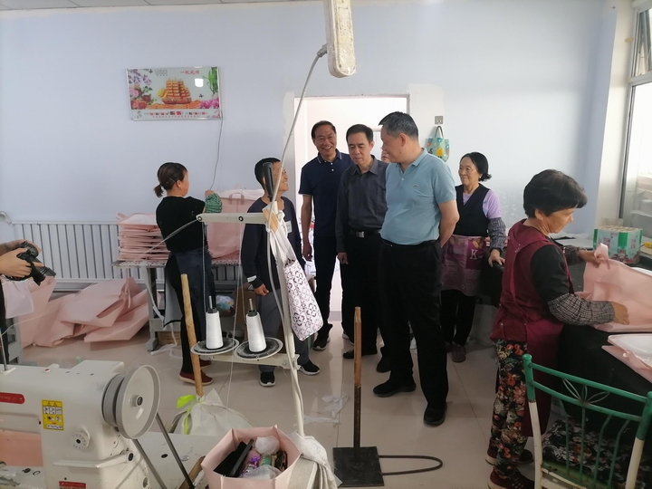 图为公司党委副书记、副董事长、总经理李玉民与党委副书记齐山水调研公司帮扶的箱包厂生产情况