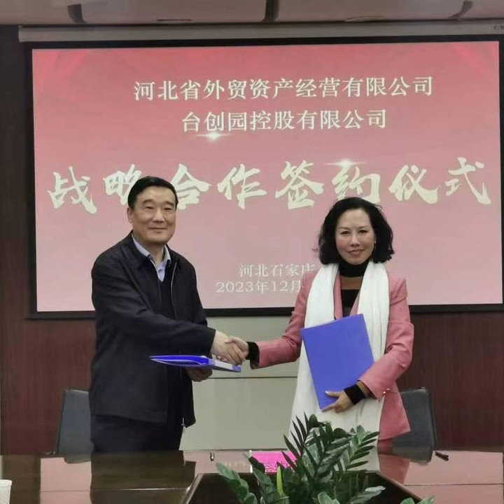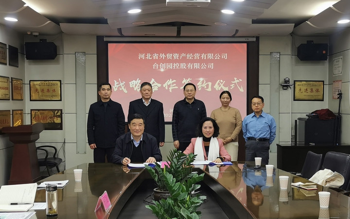 12月20日,省外贸资产公司与台湾台创园控股有限公司(以下简称台创园)战略合作协议签订仪式在省外贸资产公司举行。省外贸资产公司党委书记、董事长张元贞,党委副书记、副董事长、总经理李玉民,副总经理韩会斌,台创园集团董事局主席李丹伶,台创园河北公司董事长唐浩增出席并见证签约。