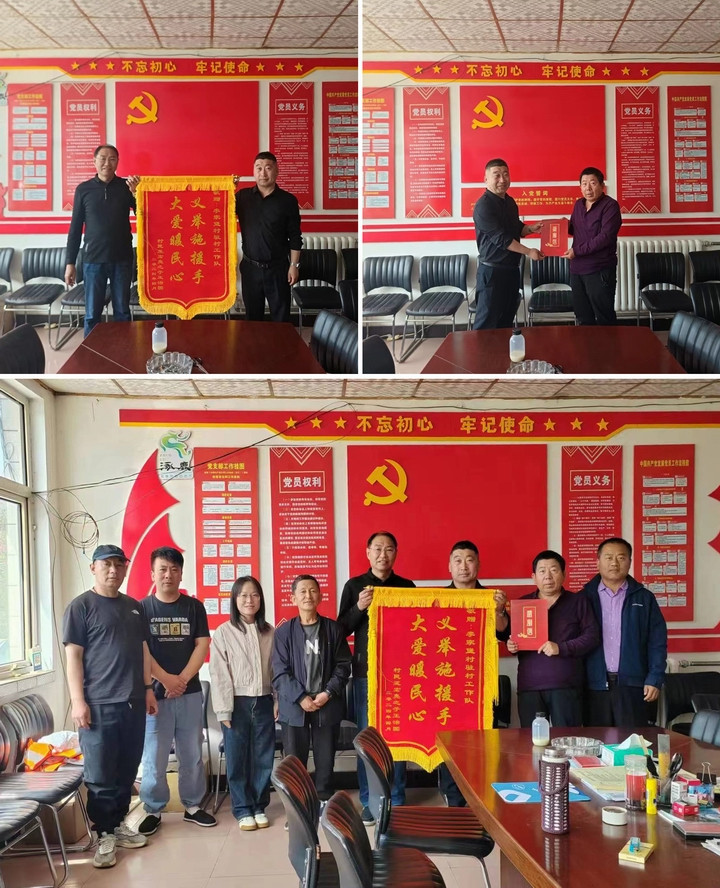 2024年4月26日上午,李家堡村老党员之子王治国等到工作队驻地,向省外贸资产公司驻李家堡村工作队送来“义举施援手,大爱暖民心”锦旗和感谢信,谢家堡乡包村干部和村“两委”班子成员共同参加了赠送仪式。